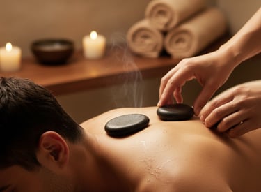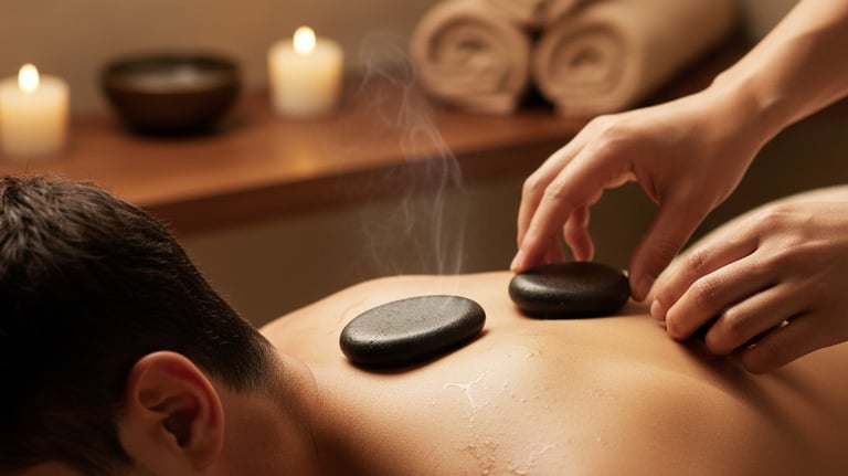 Pedras vulcânicas aquecidas conduzem o calor profundamente pelos músculos, promovendo relaxamento e bem-estar.