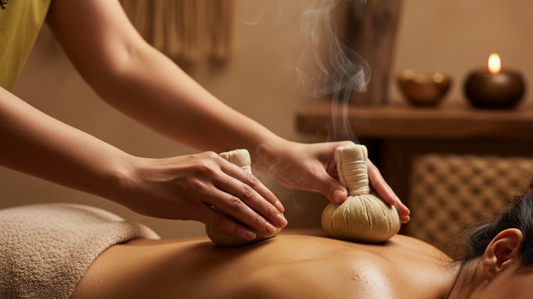 Pequenas trouxinhas com ervas medicinais aquecidas e aplicadas no corpo.